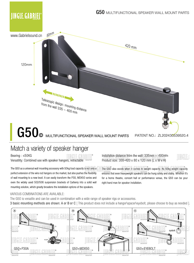 G50是承重50公斤级的通用壁挂配件,可以作为市场上全部丝杆吊架的扩展配件,它可以将本公司的P30系列、MDX50系列乃至其它市场上502/506等所有吊装架变成壁挂式安装,还可以增加吊环及铁链等软吊配件来适配所有未能匹配到吊架的非常规尺寸音箱,如需了解更多的应用方式敬请联系本公司技术人员。 |