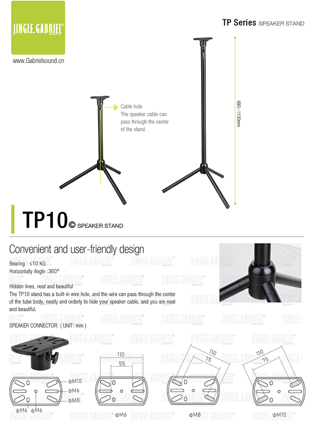 适用产品:承重≤10KG 扬声器,680mm和1130mm两种高度可选 安装方式:落地支撑 可调角度:水平