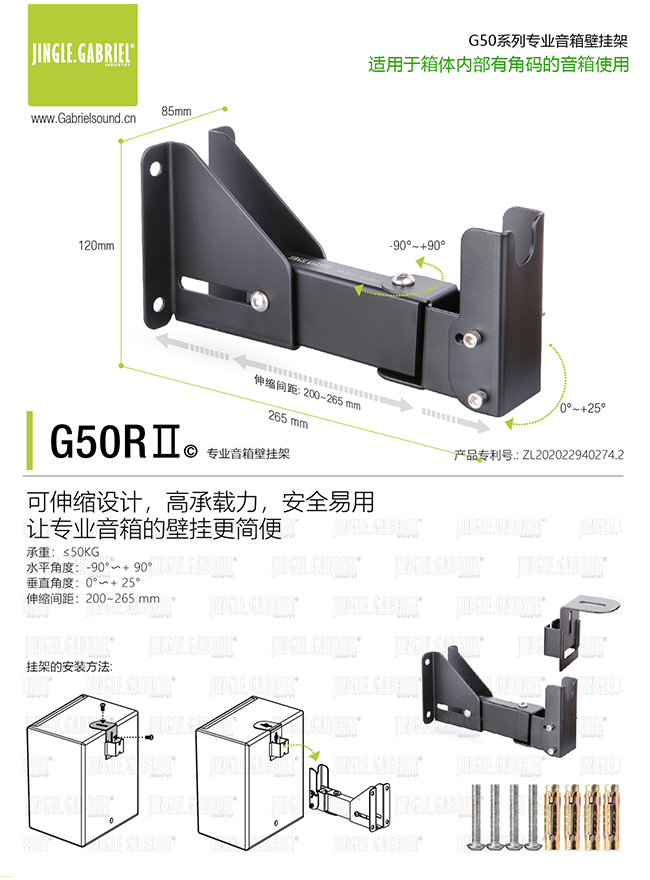 G50RII运用钢板材质制成,稳重质感 易用安全双保障。 秉承加百利品质至上、安全易用、使大音箱的安装也可以快速且简便。 承重50KG :多种专业音箱适用 8寸,10寸,12寸,15寸……等等 |