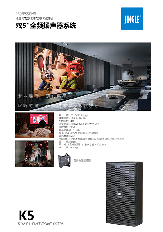 专业影音品质,随心所用。K5音箱采用加百利的专业全频段喇叭单元,运用双喇叭单元设计,提高声音覆盖度,使人声真实还原。细腻的音效如呼吸般自然享受,在家也能享受K歌娱乐。