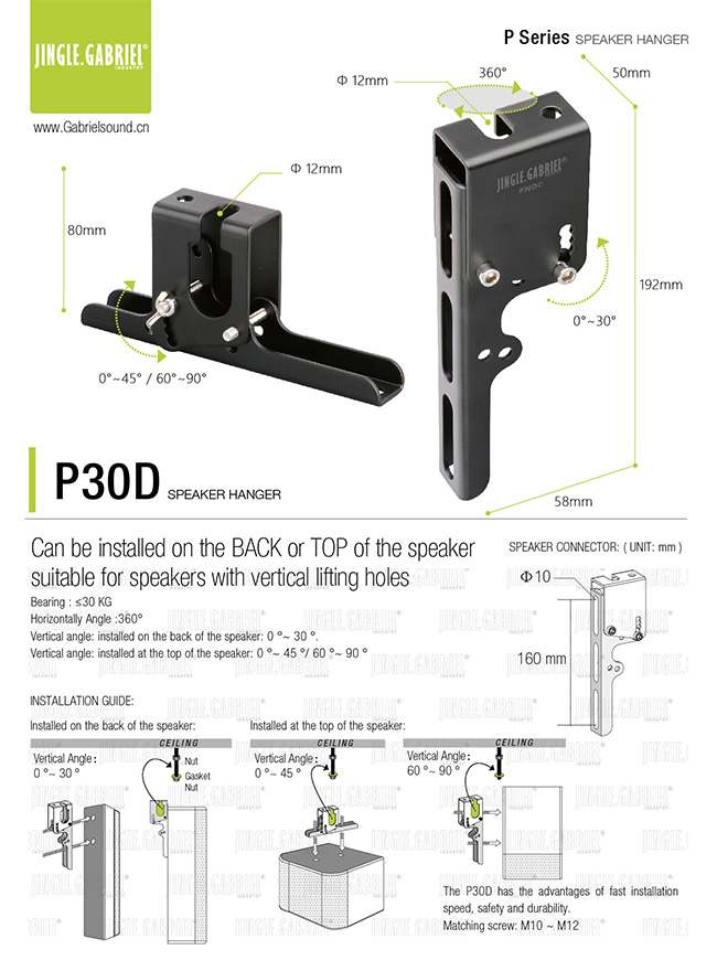 更坚固 吊装测试:比同类型挂架安装快速 更简便 适合纵向吊装孔的扬声器使用 更方便 P30D是一款灵活安装的挂件,它可以与不同长度的螺杆搭配使用。 |