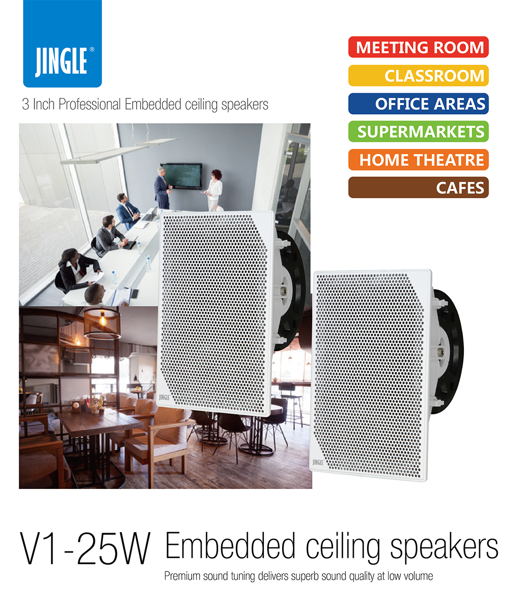 V1-25W 紧凑型全频扬声器设计具有更广泛的适用性。V1-25W具有宽广、高质量的音调,非常适合会议室使用。设计结合了美观和性能,可嵌入式安装。